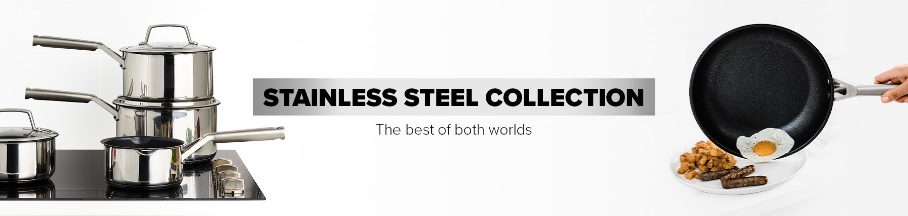 Perfect for confident chefs and kitchen newcomers alike, our Stainless Steel cookware collection is expertly crafted from polished stainless steel with an aluminium core for even heat distribution and excellent high-heat searing.